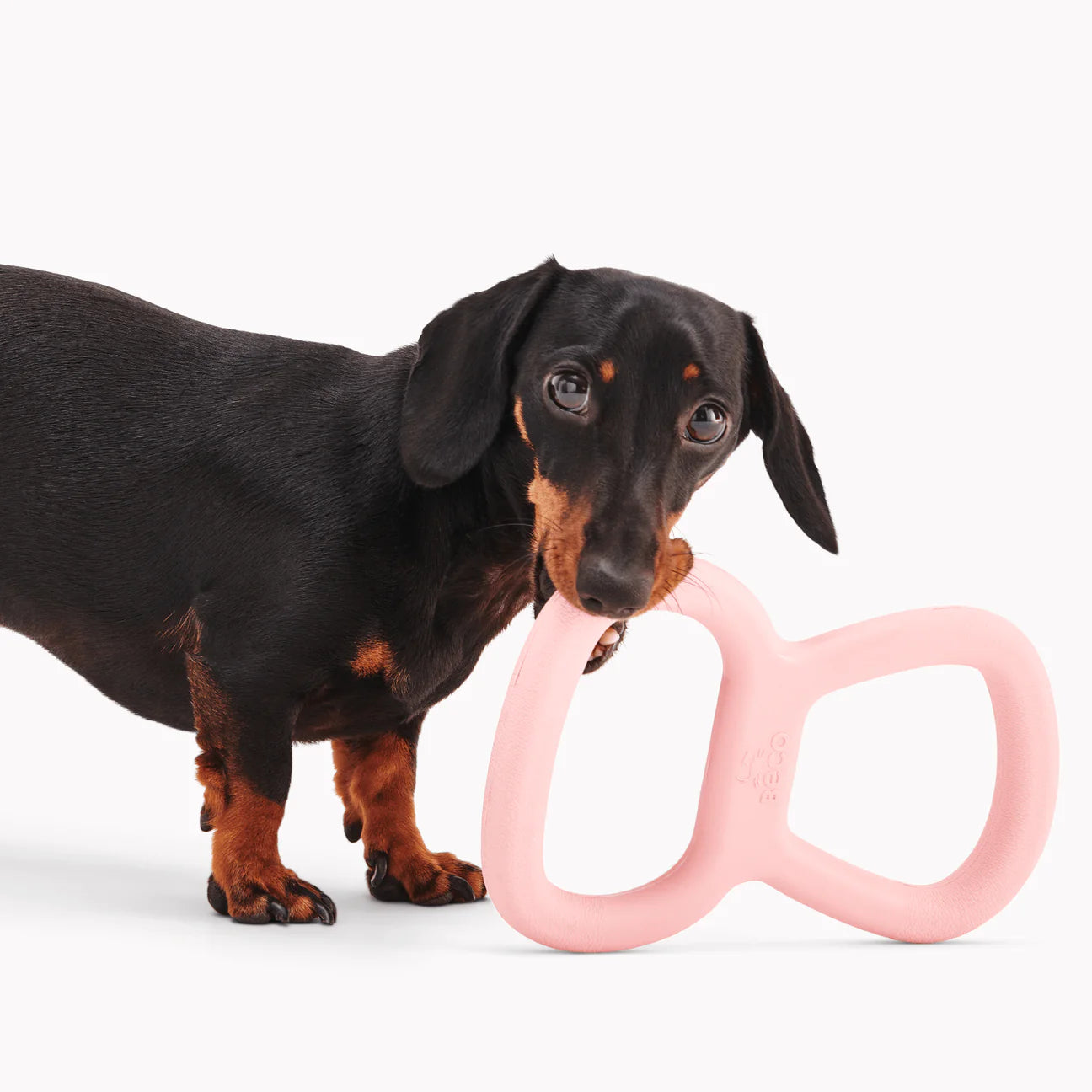 A natural rubber toy specifically designed for tug-o-war. The textured handles at each end give you both a strong grip. The springy rubber flexes as needed to help reduce the jars and jolts of your dog’s pulling power - let the games begin.