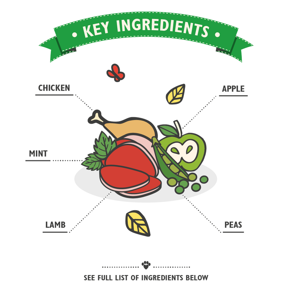 Ingredients: Potato, Glycerin, Tapioca, Freshly Prepared Lamb 10%, Cooked Chicken 5%, Apple 1%, Peas 1%, Cellulose, Sodium Bicarbonate, Mint 0.1%. Additives: Technological Additives: Antioxidants (tocopherol extracts from vegetable oils).