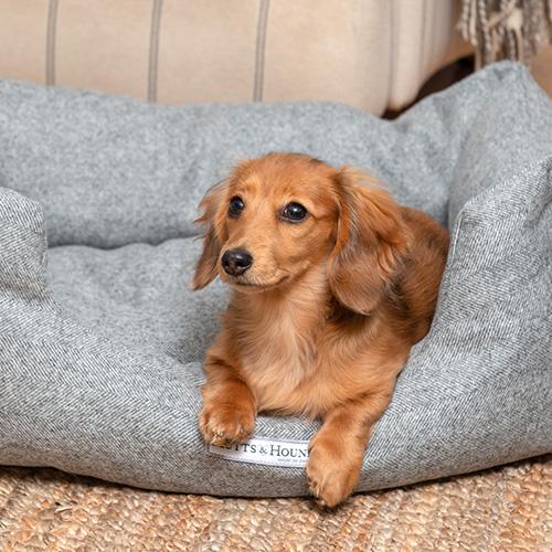 Made from premium quality Yorkshire tweed, this Stoneham Tweed Boxy Dog Bed is a beautiful, timeless cool grey with a subtle herringbone weave. The luxury wool tweed spun in Britain is chosen for its soft yet robust quality, that when cared for can stand the test of time.